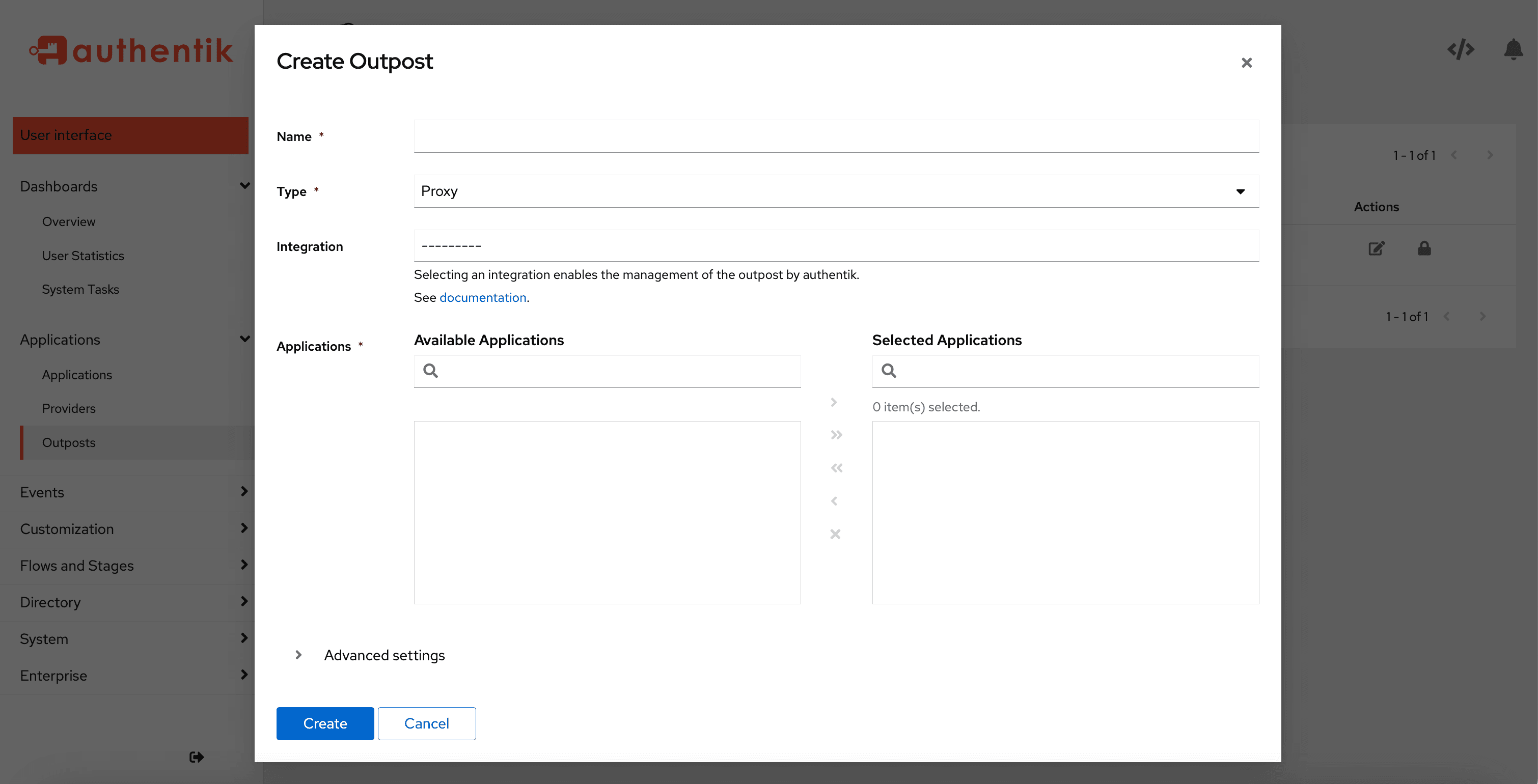 To deploy an outpost with these integrations, select them during the creation of an outpost. A background task is started, which creates the container/deployment. The outpost deployment can be monitored from the Dashboards > System Tasks page in the Admin interface.