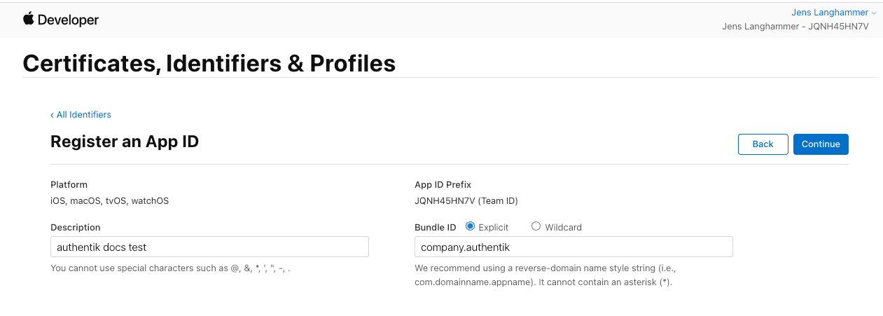 - For your bundle ID, use the reverse domain of authentik, in this case