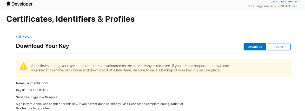 - Click on Keys in the sidebar. Register a new Key with any name, and select Sign in with Apple.